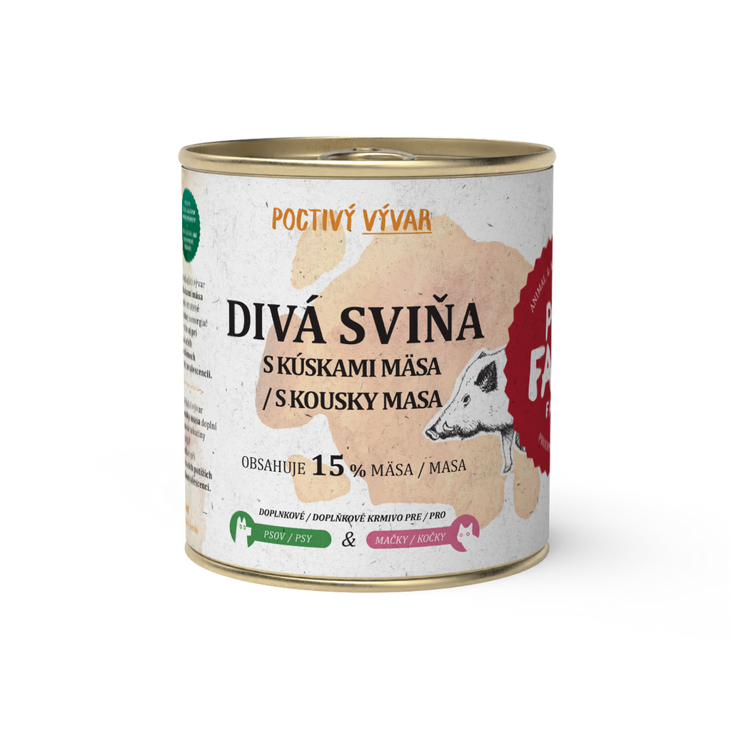 Caldo de huesos concentrado con trozos de carne de jabalí. La carne proviene de bosques checoslovacos. A diferencia del caldo en sí, calma la sed y sirve como un pequeño tentempié. También es adecuado durante la convalecencia o para problemas digestivos. Bajo en grasas.