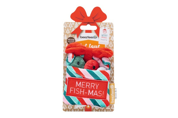 Este regalo navideño con peces tiene la forma de una preciosa bolsa de regalo. La bolsa, hecha de papel de aluminio arrugado, está rellena de tres peces de colores. Estos peces también tienen papel de aluminio arrugado en el cuerpo y están rellenos de hierba gatera. La hierba gatera le da a tu gato un incentivo extra para jugar, y la hierba también puede ayudarlo a relajarse en situaciones estresantes o durante la ajetreada temporada navideña.