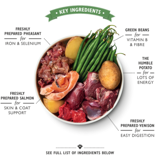 ciervo (40 %), faisán (15 %), salmón (10 %), patatas, calabaza moscada, judías verdes, manzanas, minerales, aceite de cáñamo, vara de oro, ortiga, semillas de anís, escaramujo, flor de caléndula, amor de hortelano, pamplina, alfalfa, cardo mariano, raíz de diente de león, raíz de bardana, semillas de apio.