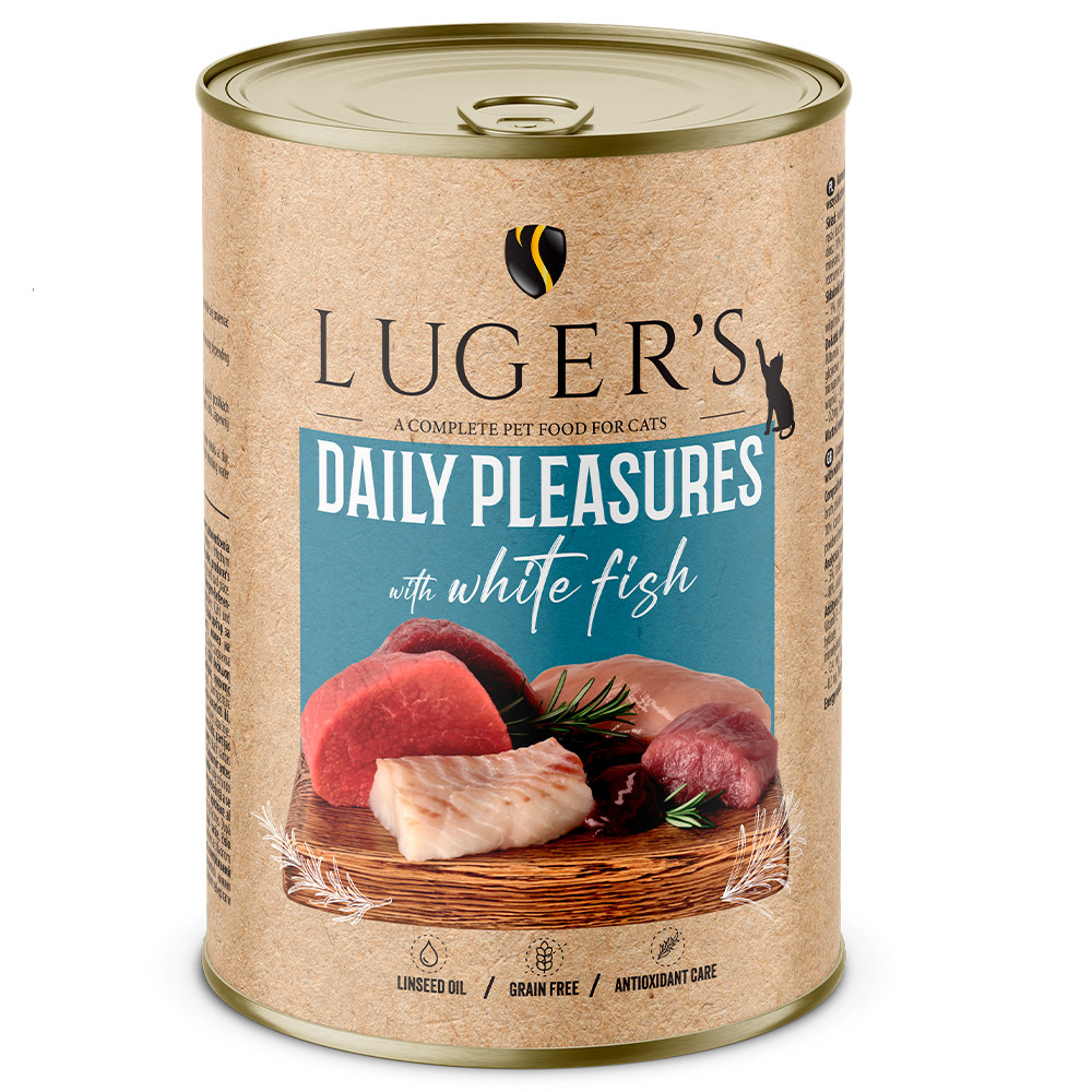Lugers Daily Pleasures es una gama de alimento húmedo completo para perros y gatos, elaborada con ingredientes de alta calidad y pensada para cubrir las necesidades nutricionales diarias de peludos de cualquier edad y tamaño(ya sea perro o gato). Sus recetas combinan proteínas de origen animal de grado humano con verduras seleccionadas, ofreciendo una alimentación equilibrada, digestible y muy apetecible.