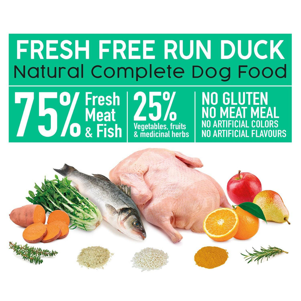 Alimento completo semihúmedo para todo tipo de perros de cualquier edad, tamaño y raza. Con un 55% de pato fresco, un 20% de pescado fresco y un 25% de vegetales, frutas y hierbas medicinales.