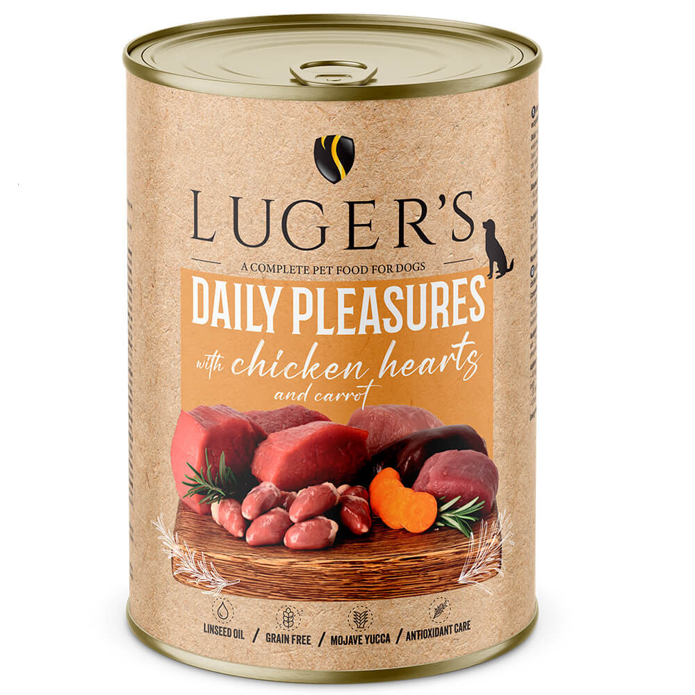 Lugers Daily Pleasures es una gama de alimento húmedo completo para perros y gatos, elaborada con ingredientes de alta calidad y pensada para cubrir las necesidades nutricionales diarias de peludos de cualquier edad y tamaño(ya sea perro o gato). Sus recetas combinan proteínas de origen animal de grado humano con verduras seleccionadas, ofreciendo una alimentación equilibrada, digestible y muy apetecible.
