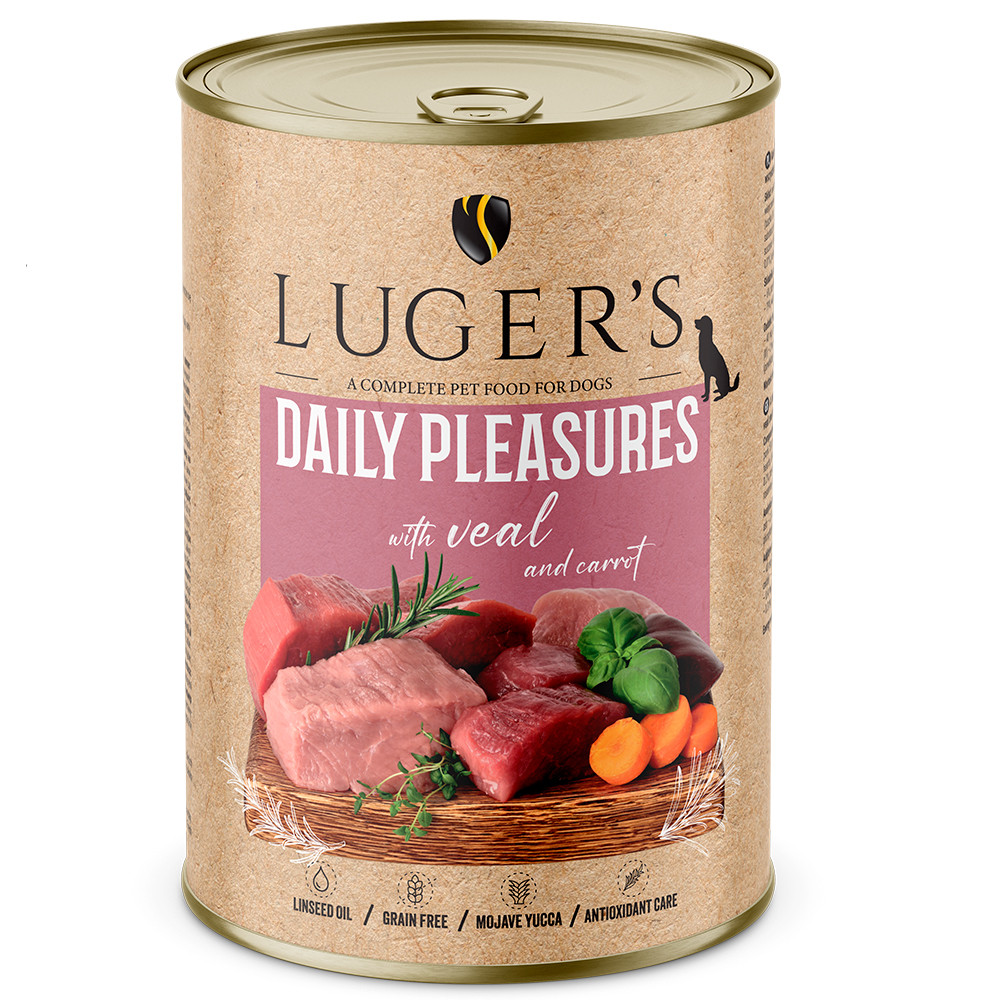 Lugers Daily Pleasures es una gama de alimento húmedo completo para perros y gatos, elaborada con ingredientes de alta calidad y pensada para cubrir las necesidades nutricionales diarias de peludos de cualquier edad y tamaño(ya sea perro o gato). Sus recetas combinan proteínas de origen animal de grado humano con verduras seleccionadas, ofreciendo una alimentación equilibrada, digestible y muy apetecible.