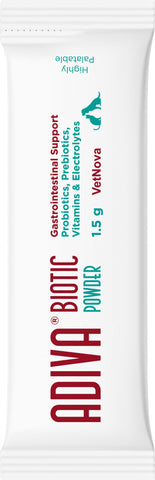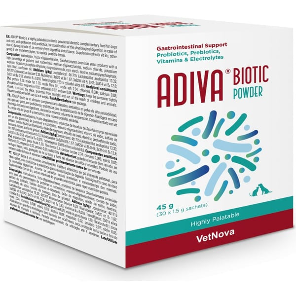 ADIVA® Biotic Powder para perros y gatos es un alimento complementario dietético de alta palatabilidad diseñado para apoyar la función intestinal normal. Formulado con probióticos, prebióticos (FOS y MOS), electrolitos y vitaminas del grupo B, actúa de forma sinérgica para ayudar a estabilizar la digestión fisiológica durante trastornos gastrointestinales o en periodos de recuperación.