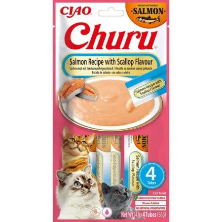 Todas las recetas de Churu están elaboradas con ingredientes de calidad y vienen en un formato de 4 unidades individuales de 14g cada una en forma de tubito por lo tanto en total serán 56g.