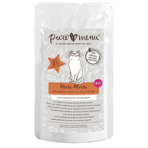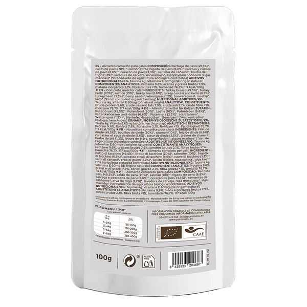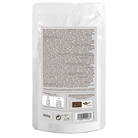 Composición: Pechuga de pavo (49,5%)*, caldo de pavo (20%)*, salmón (10%)*, hígado de pavo (6,6%)*, carcasa y cuellos de pavo (6,6%)*, corazón de pavo (3,3%)*, semillas de cáñamo*, hierba de trigo (1,2%)*, levadura de cerveza, escaramujo*, ascophyllum nodosum (algas marinas)*