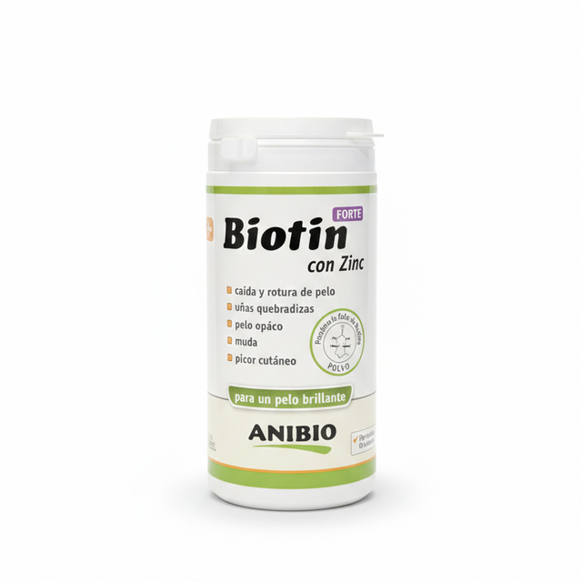 ANIBIO Biotina con Zinc es un suplemento alimenticio para perros y gatos EN POLVO, muy cómodo de administrar junto a su comida 1 vez al día.